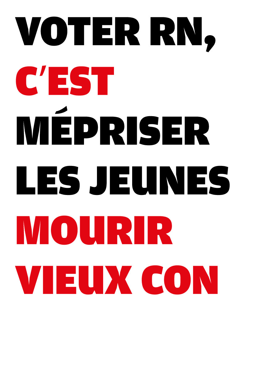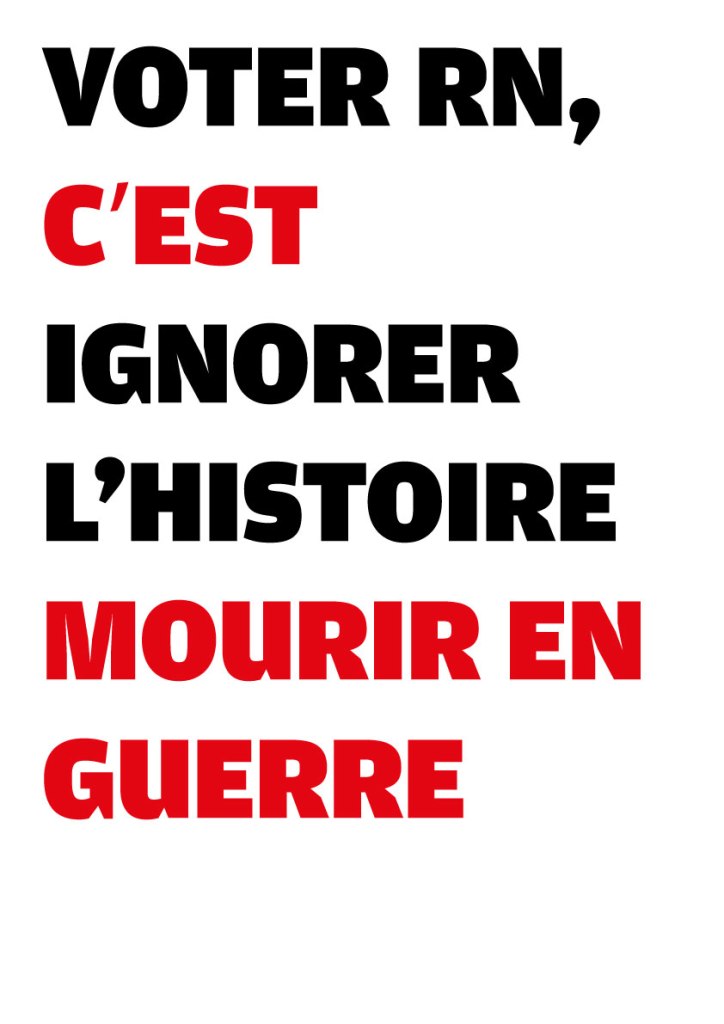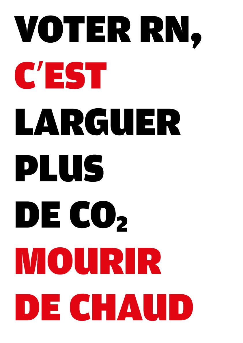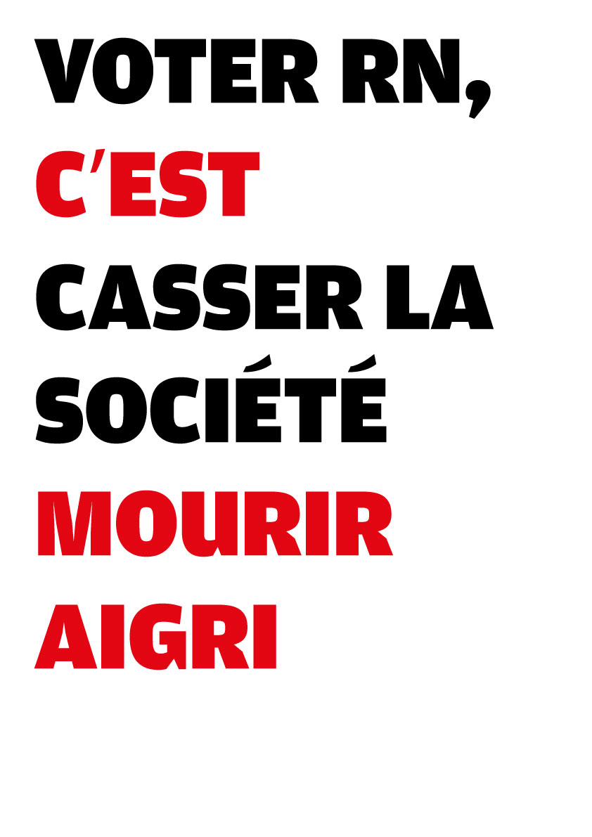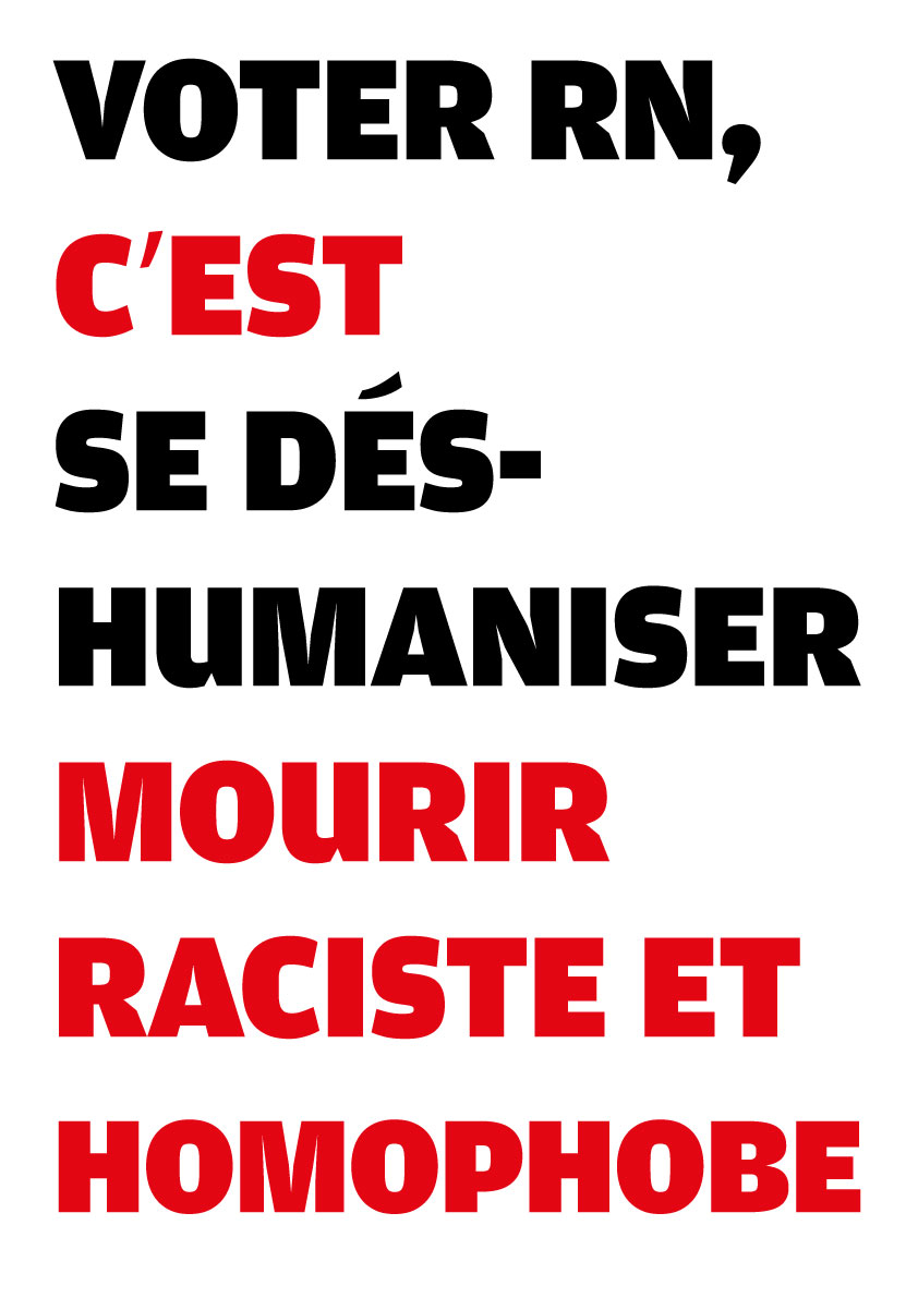 Avec des camarades atterrés par la situation politique en France, nous avons conçu une série de 25 visuels pour dénoncer la politique mortifère du RN. N’hésitez pas à les télécharger d’un simple clic droit et les diffuser sur le web (avec le format .jpg), ou les imprimer (à partir du format .pdf, en A3 ou A4, disponible plus bas).