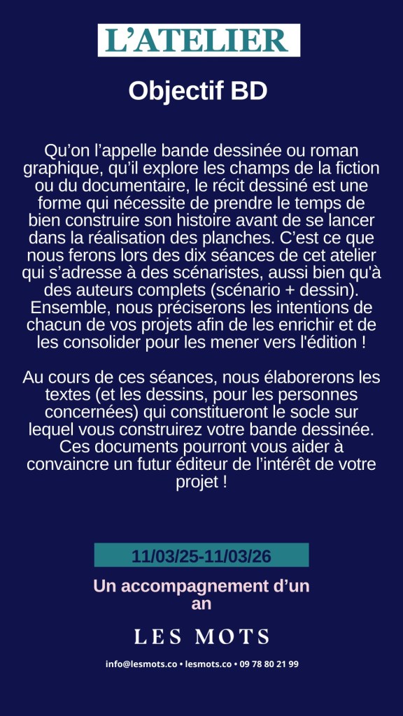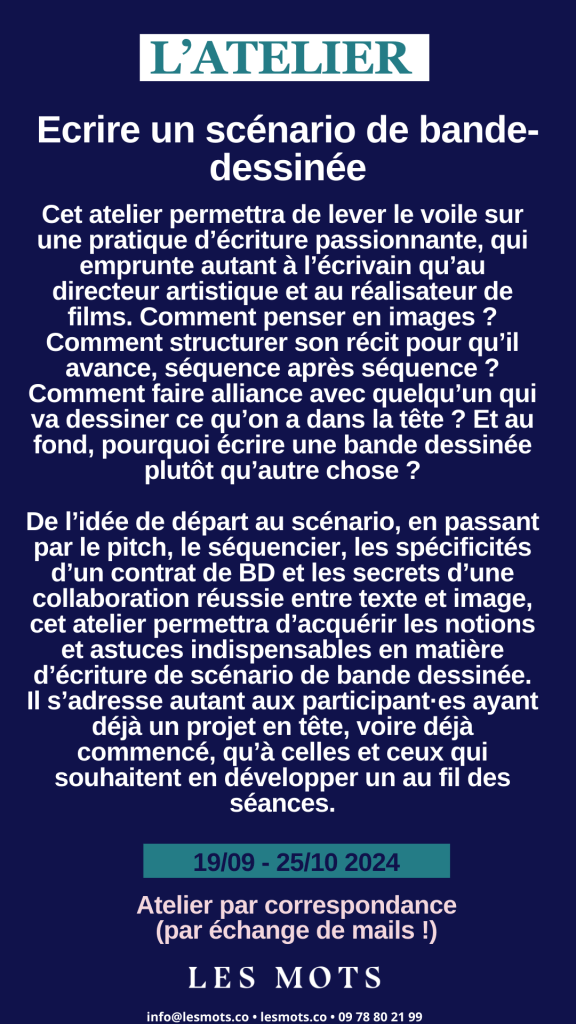 Du 19 septembre au 25 octobre 2024, j’avais donné un premier atelier d’écriture collectif, consacré au lancement du scénario de bande dessinée à l’école parisienne Les Mots, accessible en ligne et ouvert à tous et à toutes, sans prérequis particuliers, hormis l’envie d’écrire.