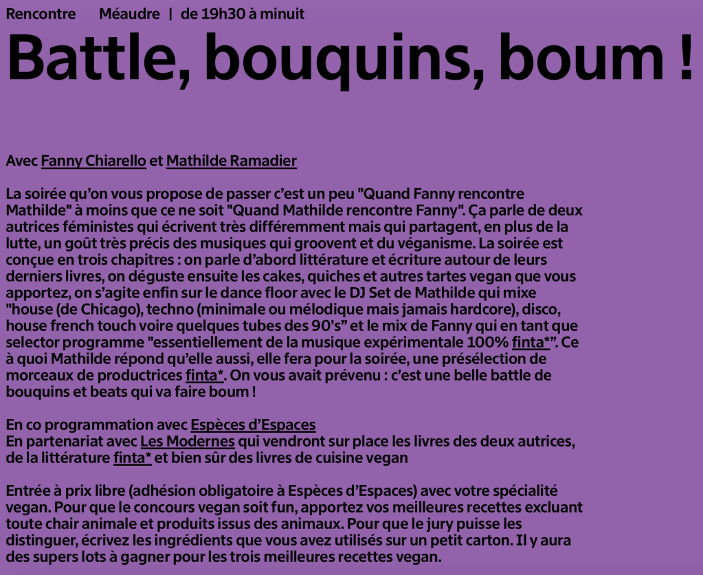 Le vendredi 17 octobre sera ainsi organisée une soirée littéraire, suivie d’un battle DJ, avec une autre écrivaine en résidence à cette période, Fanny Chiarello.