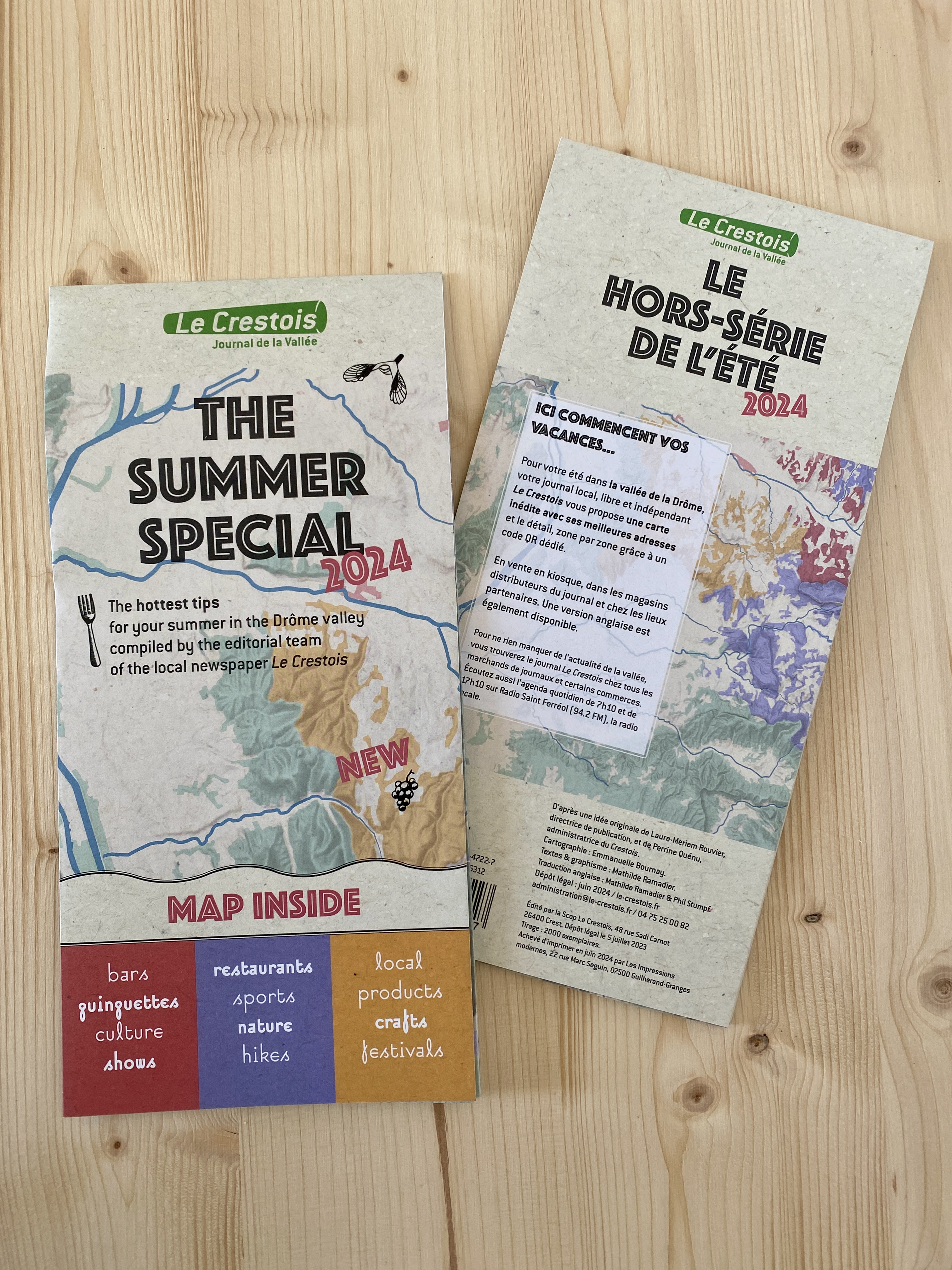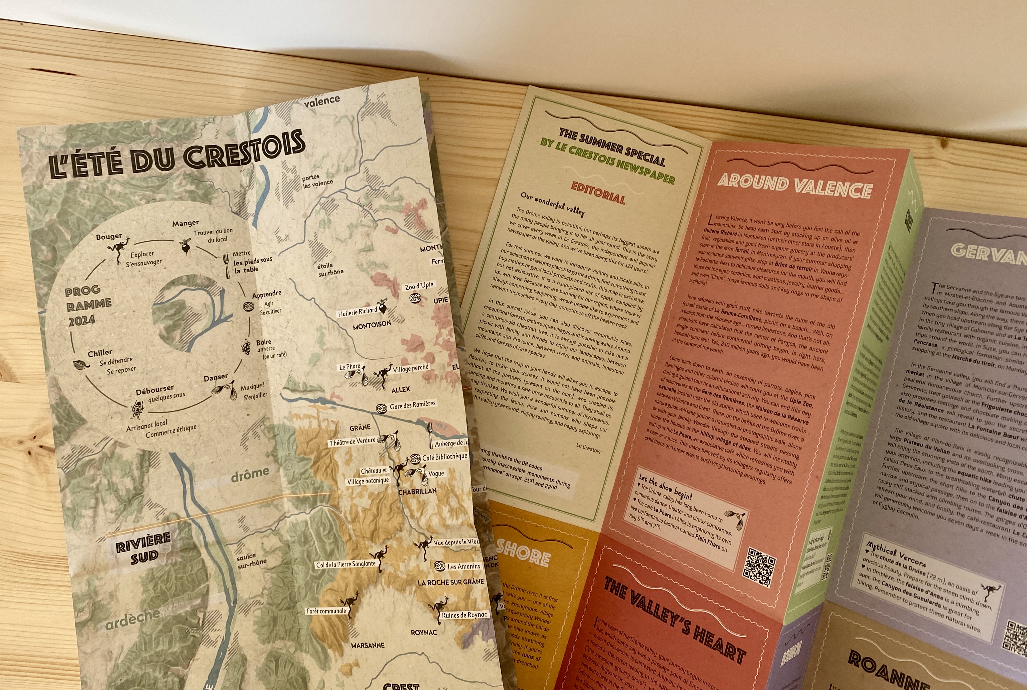 Le Hors-série de l’été : carte de tourisme sur la vallée de la Drôme pour l’été 2024, commandée par le journal local indépendant Le Crestois, en partenariat avec la cartographe Emmanuelle Bournay. Textes, design graphique et traduction vers l’anglais. Disponible dès le 14 juin en kiosque, dans les points de vente habituels du journal et chez les lieux partenaires.