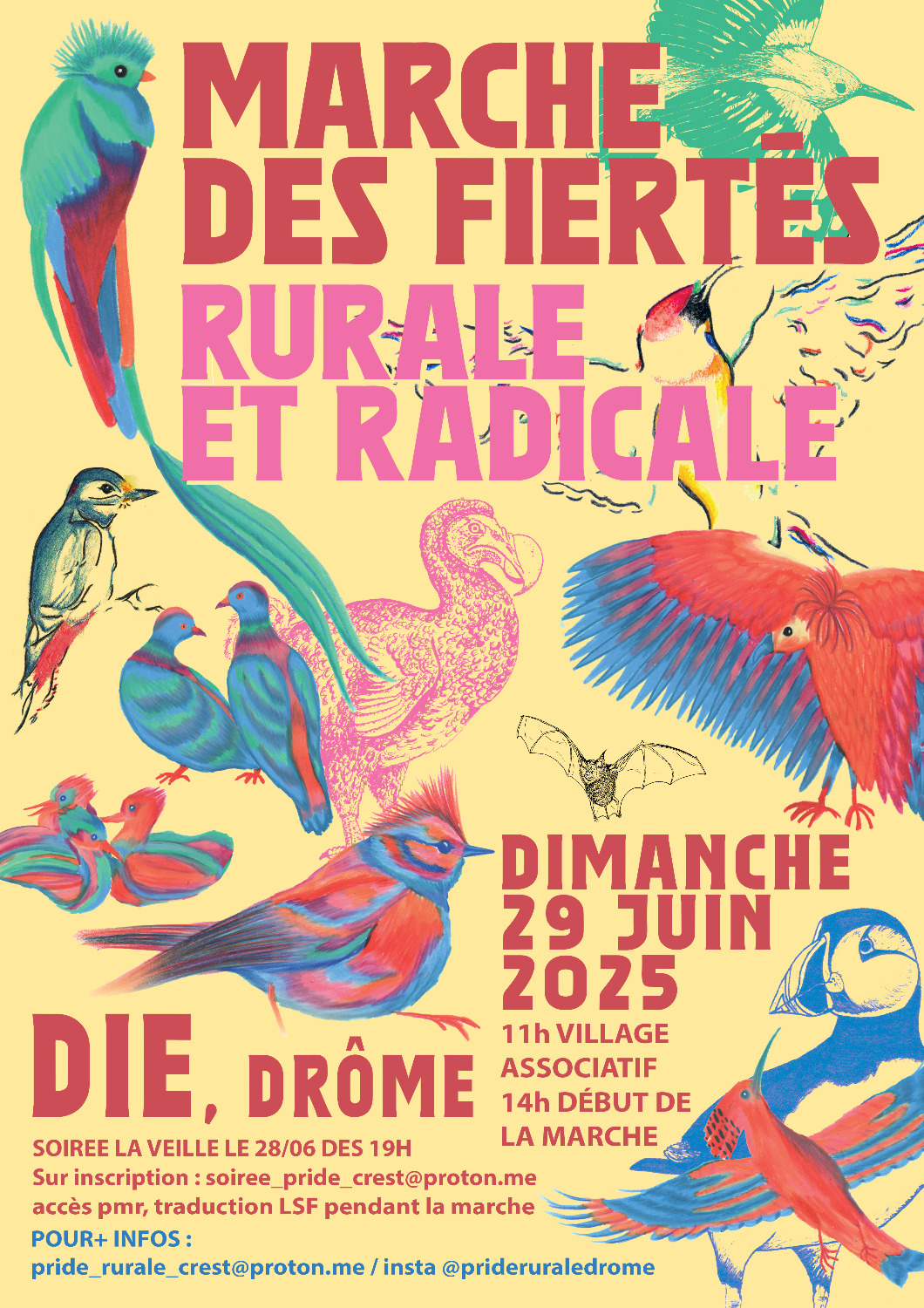 Travail collectif début 2025 : conception graphique pour la Marche des fiertés rurale de la vallée de la Drôme, en collaboration avec d’autres personnes impliquées dans le collectif, qui ont en outre réalisé les dessins, ainsi que les déclinaisons sur divers supports de communication.